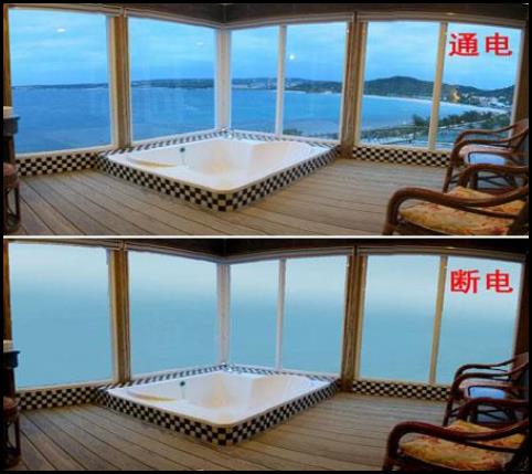 PDLC液晶调光玻璃事实上是将PDLC液晶调光膜夹层于两层玻璃之间。利用PDLC液晶膜通电透明,断电磨砂的特性,广泛应用于各种隐私保护的商业空间装饰,酒店装潢,投影展示等领域。
